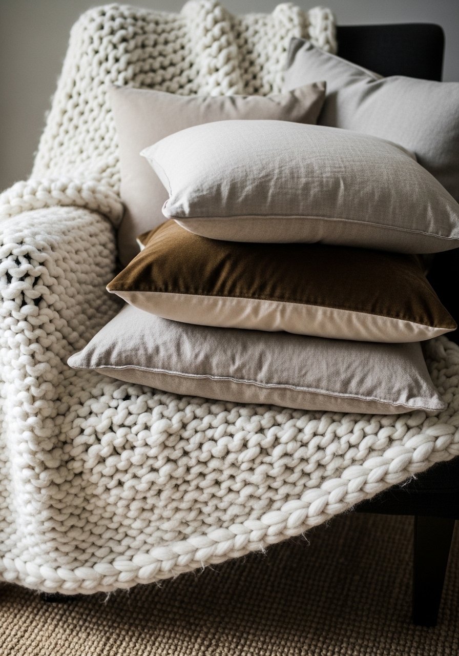 I made a reading nook feel lived-in by combining a cream chunky knit throw with linen and velvet pillows in odd numbers. Warm neutrals are everywhere now, so I used one bold rust pillow to anchor the palette. Keep the ratio 2 linen : 1 velvet for balance. Avoid piling too many small cushions — that looks cluttered instead of curated. This mix adds depth and invites you to sit.