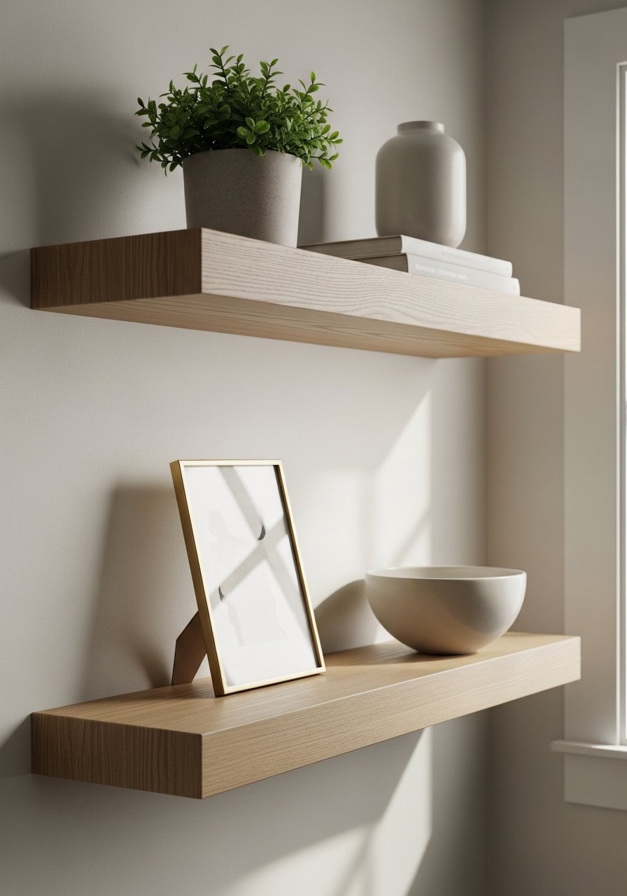 White oak floating shelves feel current and clean. I installed three staggered shelves and styled them with a tall ceramic vase, a small artificial fiddle leaf fig in the corner, and a couple of thrifted books. Keep odd numbers and vary heights for visual rhythm. A common mistake is overfilling each shelf; leave breathing room to read the arrangement. This instantly makes a narrow entry look intentional and airy.