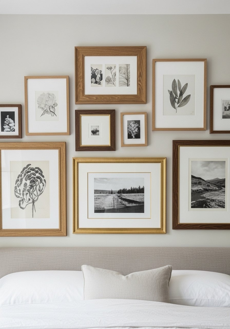 I curated a gallery wall using thrifted frames paired with new white mats to keep it modern. Mixing brass with dark wood stops the wall from feeling matchy. I used mixed metal picture frames as anchors and filled gaps with woven textile scraps. Tip: map the layout on kraft paper before hammering. Avoid tiny frames only; too many small pieces reads busy rather than intentional.