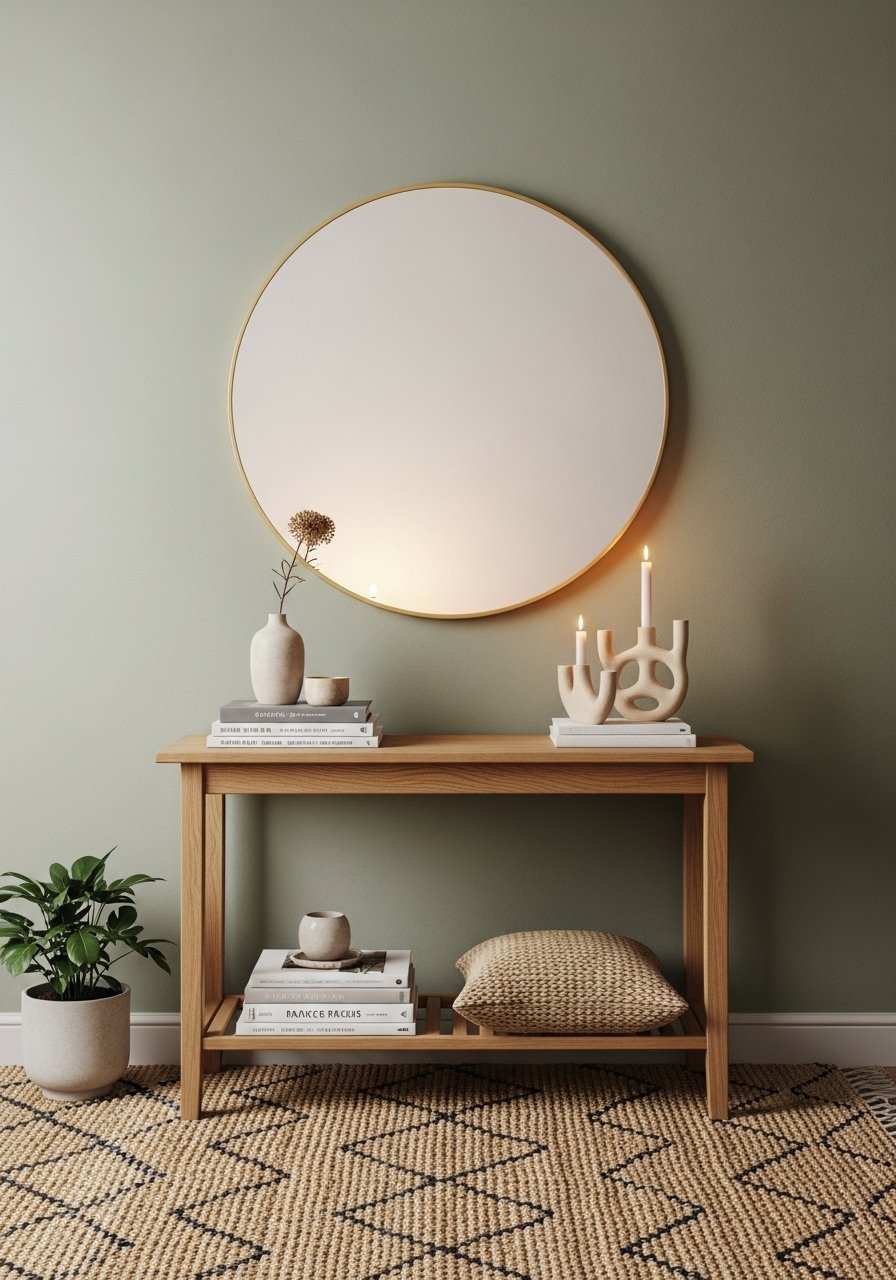 An oversized round mirror bounces light and visually doubles the room. I hung a 36-inch round mirror opposite a window and watched the space pop. Pair it with a slim console and a single sculptural lamp to avoid competing focal points. The frequent mistake is placing a mirror too high — hang it at eye level so it reflects the room, not just ceiling. This trick makes compact rooms feel more open.
