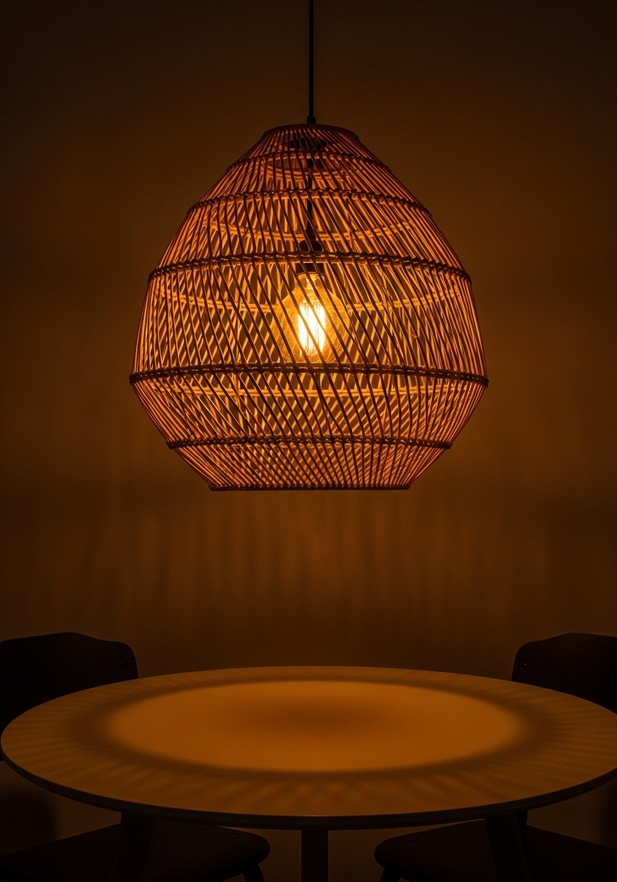 Rattan Pendant and Layered Lighting for an Earthy Dining Corner