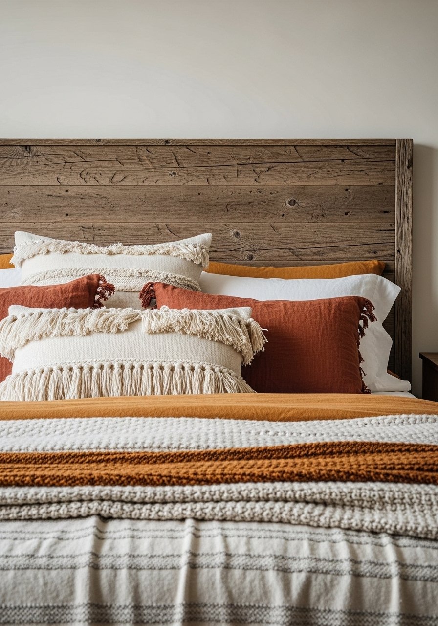 I built a simple reclaimed wood headboard and stained it warm oak to match my floating shelves. The grain anchors the bed and makes linens pop. I paired it with neutral bedding and a fringe pillow to add softness. Avoid over-sanding; the character comes from knots and small imperfections. If you don’t want construction, a faux reclaimed panel or a large wall tapestry works similarly and pairs well with Euro pillows and a linen duvet for a grounded, cozy bedroom.