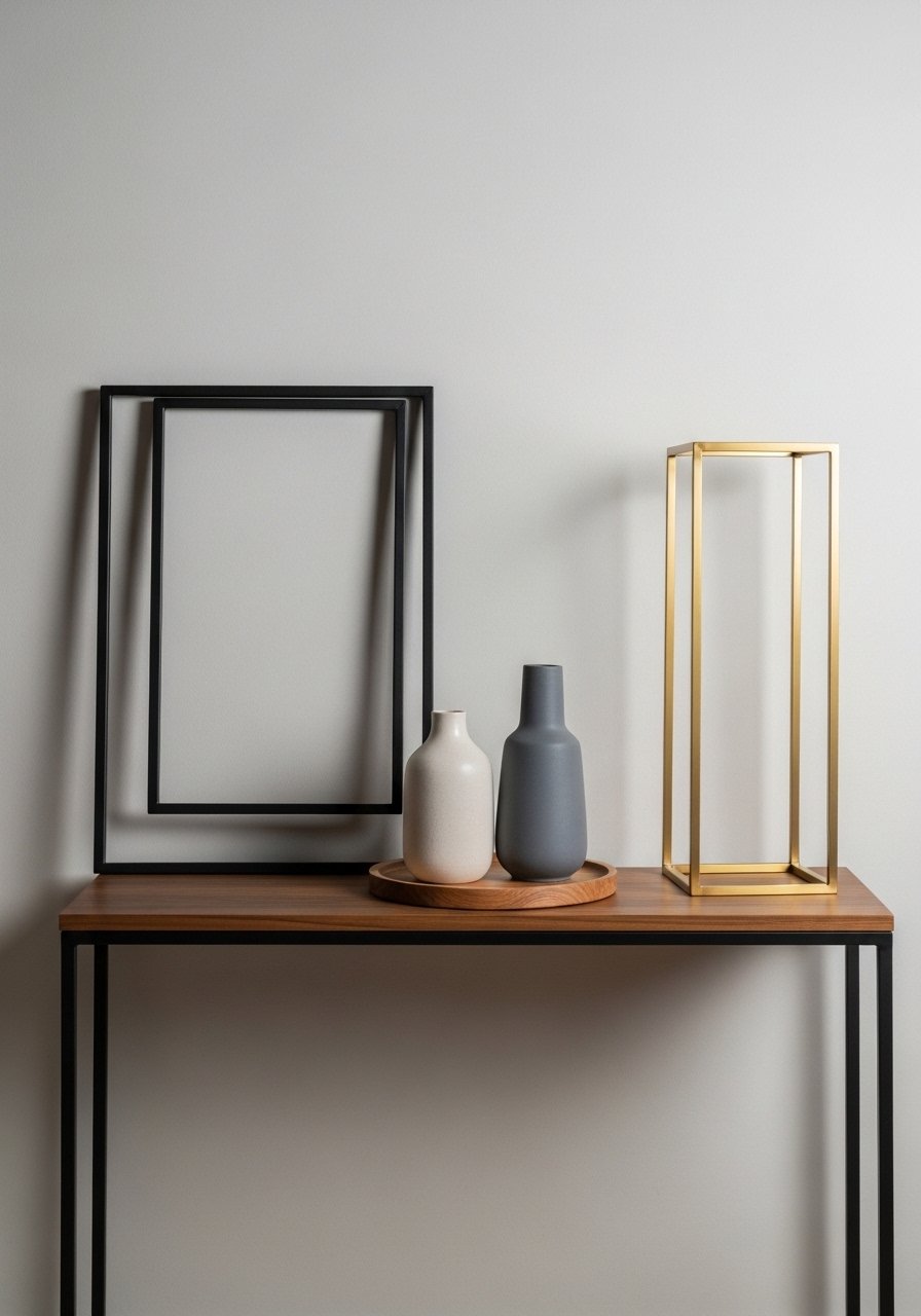 I mixed warm brass with matte black frames and soft ceramic vases to keep the look current. Introducing different metals in small doses — lamp, frame, and hardware — prevents clashing. I used mixed metal picture frames and a neutral ceramic bowl to ground the vignette. A common misstep is matching every metal; variety looks intentional. This approach adds visual interest while keeping the palette cohesive.