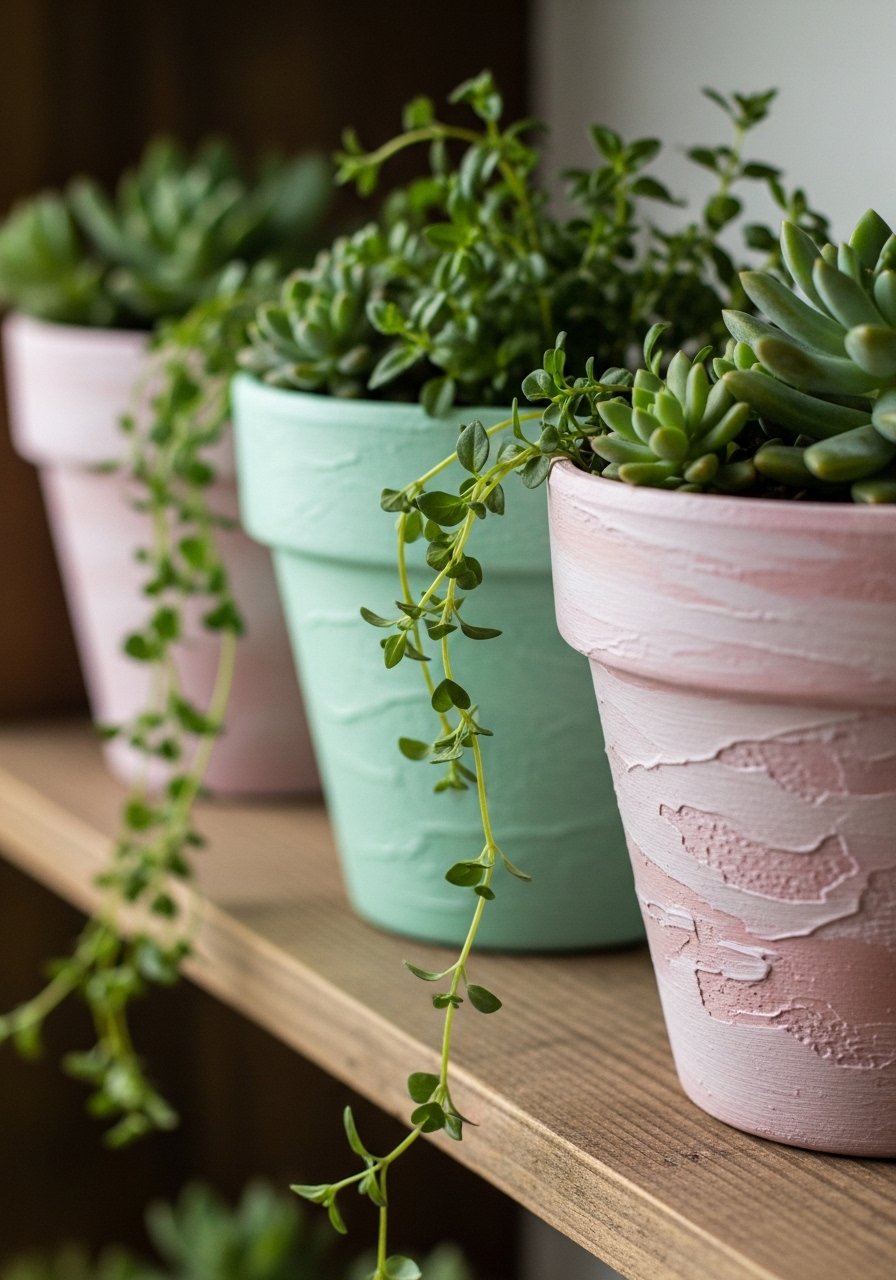 I painted terracotta pots in earth tones and stacked them on a white oak floating shelf to give my plant corner a curated gallery feel. I recommend matte acrylics and a light wash of raw umber for aged clay looks. Plant herbs or succulents for texture and scent. A common mistake is matching all pots exactly — vary heights and pattern density in odd numbers for a polished, minimal organic result. These are inexpensive and brightened my balcony instantly.
