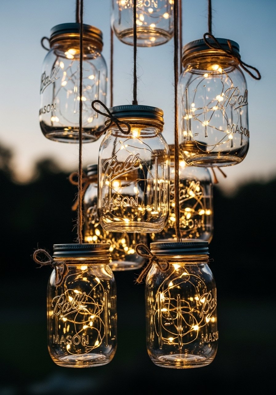 Mason jar lanterns with twine and LED fairy lids are one of my fastest ways to make a porch feel edited. Group three at different heights so light reads like a gallery installation. I use warm LED Edison bulbs inside larger jars for depth. The easy mistake is wiring too many tiny lights — keep each jar simple. These are budget-friendly and double as table centerpieces for summer dinners. They withstand light weather and look purposefully arranged.