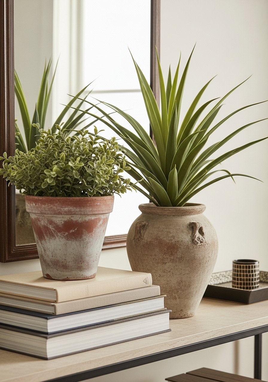 Faux Plant Vignette in Aged Clay Pots (Biophilic Natural, Low-Maintenance)