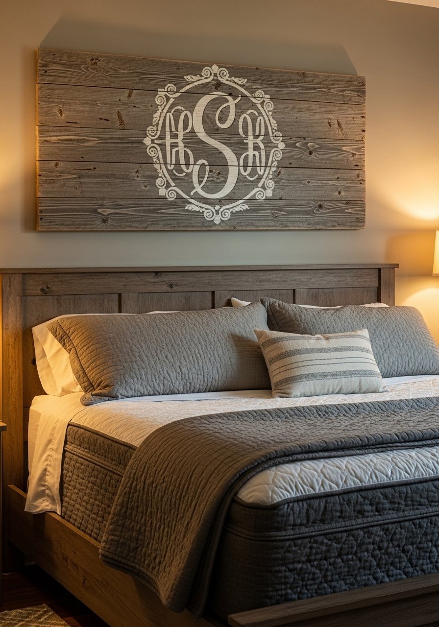 A reclaimed wood monogram sign makes a simple wall feel bespoke. I sourced a plank, sanded the edges, and painted a soft white monogram using Rae Dunn-style letters. Personalization is what separates craft from gallery. Avoid heavy varnish — I like a low-sheen finish so the grain shows through. If you prefer not to distress wood yourself, AR Workshop offers custom options that still feel artisanal. This is a splurge-save project that adds sustainable warmth.