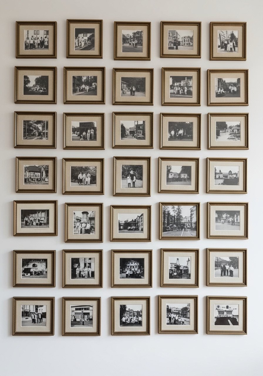 A tight grid of mixed-metal frames makes photos look editorial. I mixed brass and nickel frames for contrast and used white picture mats to keep things cohesive. The key is uniform spacing and consistent mat sizes so the metals read like design choices, not clutter. Avoid different photo orientations in a small grid — keep it consistent. This approach elevates family photos into a gallery wall without breaking the bank.