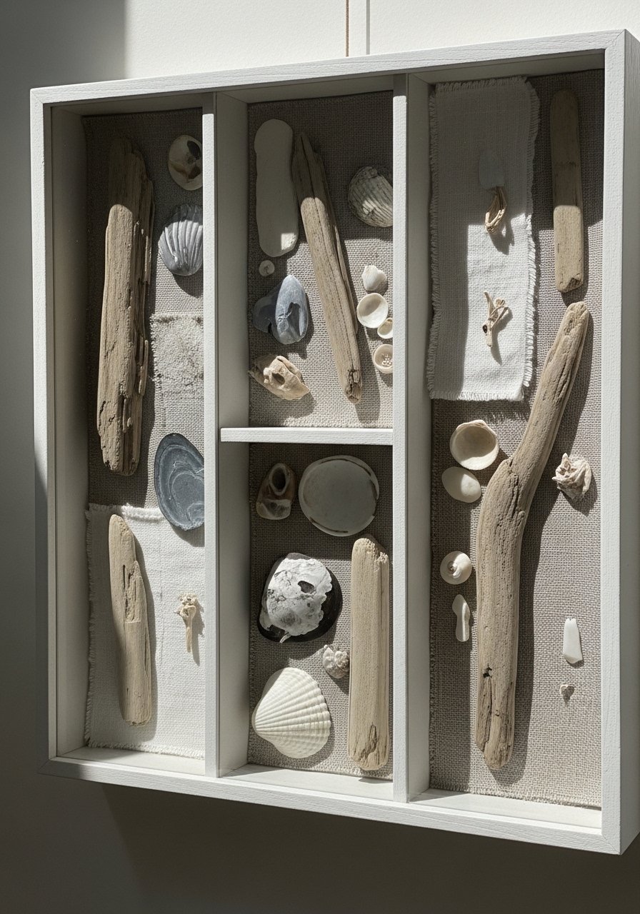 I assembled a found-object collage in a shadow box using beach finds and small textile scraps. The composition reads editorial by balancing scale, negative space, and a limited palette. Use three boxes in a horizontal row for gallery rhythm. Avoid stuffing every crevice — the eye needs breathing room. This project solves the "what to do with small souvenirs" problem and brings coastal decor ideas indoors in a curated way.