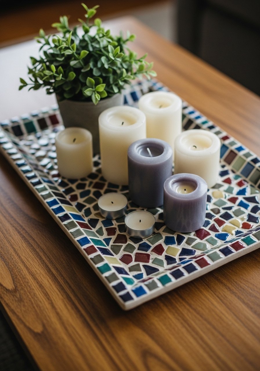 A small ceramic tile mosaic tray on my coffee table functions as art and a catch-all. I mixed glazed tiles with matte stone pieces for contrast, then sealed with grout and a water-resistant finish. The mosaic reads intentional when kept to a simple color story. A common mistake is too many colors — pick two neutrals and one accent. This brings earthy tones and timeworn textures to everyday surfaces in a practical way.