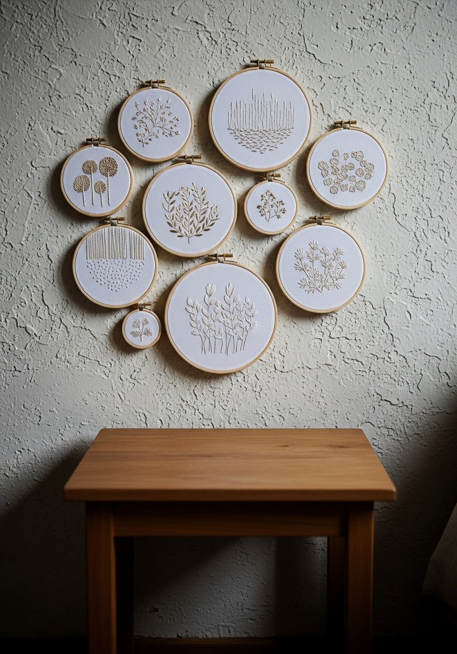 I embroidered simple shapes in a neutral palette and added metallic thread highlights for soft glints that catch the light. Grouped in odd numbers, they read like a curated collection. The gallery feel depends on consistent hoop sizes and spacing. Avoid overly busy stitching; the beauty is in restraint. These lightweight pieces are great for renters and add a personal, handmade touch without looking amateur.