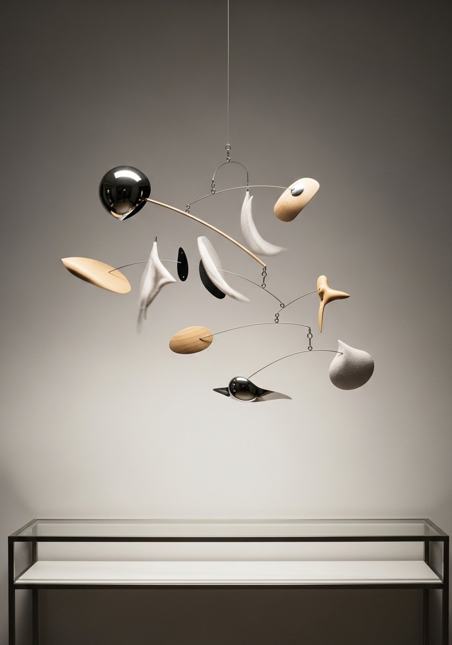 Mixed-Material Mobile as Kinetic Wall Sculpture (Artisan, Playful)