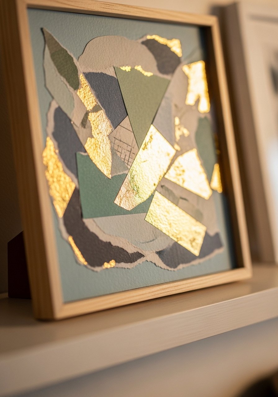 I layered painted papers and added a thin gold-leaf accent to create a small collage that catches the eye on a shelf. The gold detail reads gallery-level when paired with neutral layers. Keep proportions balanced and avoid overusing metallics. This solves the "empty small shelf" problem and plays nicely with faux greenery and small ceramic pieces.