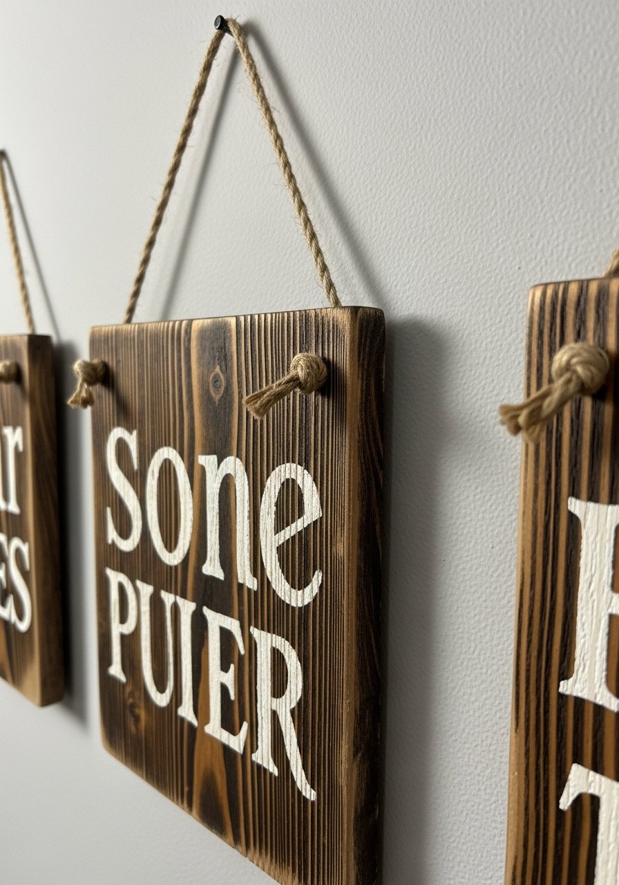 I used a heat gun and sandpaper to distress wood plaques, then added hand-painted lettering for a farmhouse wall art feeling. The timeworn texture is what reads gallery-level. Keep lettering simple and use stencils for even results. Avoid glossy sealers; matte finishes maintain authenticity. These are inexpensive, customizable, and pair perfectly with Rae Dunn-style accessories and reclaimed wood accents.
