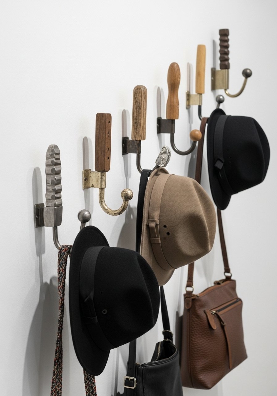 I installed small sculptural hooks with mixed metals and wood to create a functional art row. They keep the entry tidy and look intentional like gallery pieces. Vary heights and spacing for a collected look. Avoid installing them in a straight line at eye level — stagger for interest. These are practical, hold daily use items, and bring texture and timeworn finishes into heavy-traffic zones.