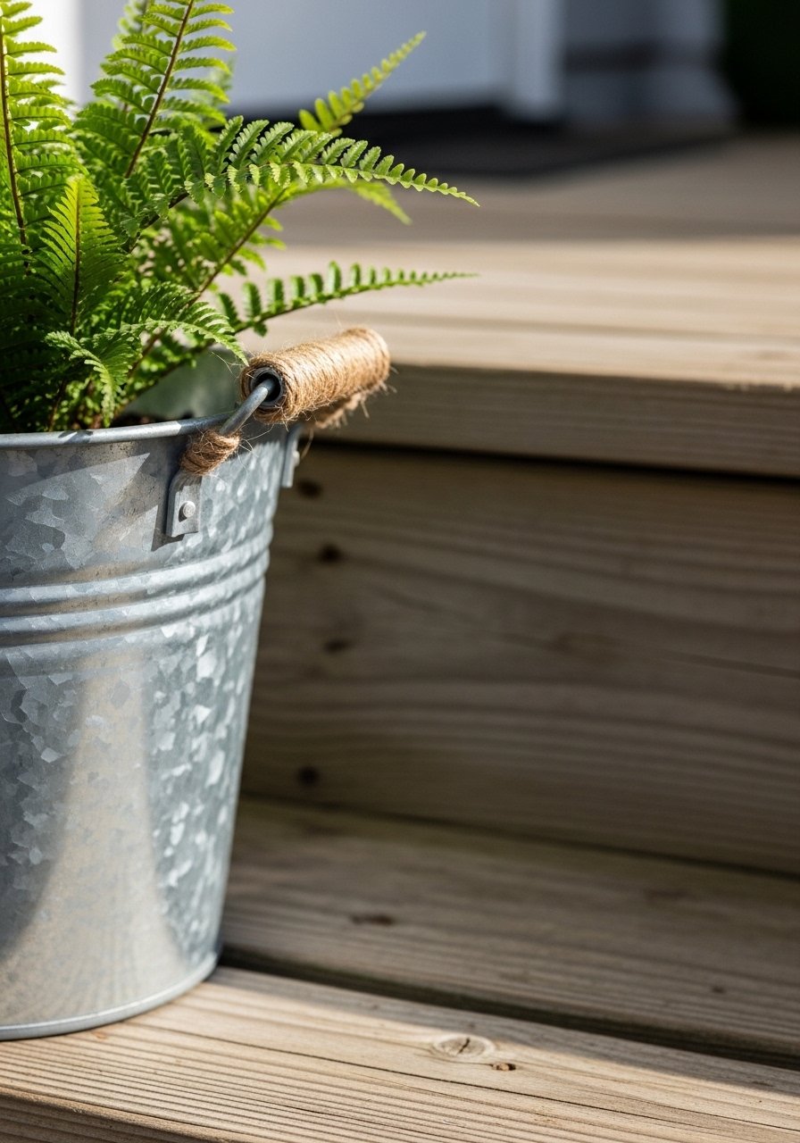 I bought cheap buckets from the dollar store and stained the handles. They immediately read farmhouse instead of plastic. Greenery — even a simple fern — brings the porch to life without fuss.