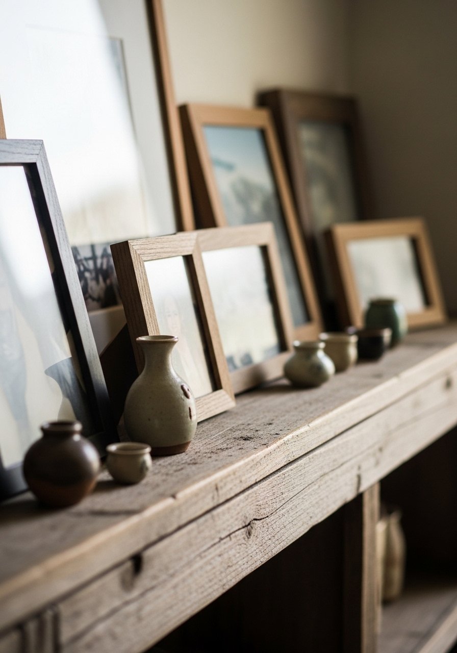 I installed a thin distressed plank as a picture ledge above the sofa. It lets me layer frames and swap art without hammering. The rough wood adds the weathered note my room needed.