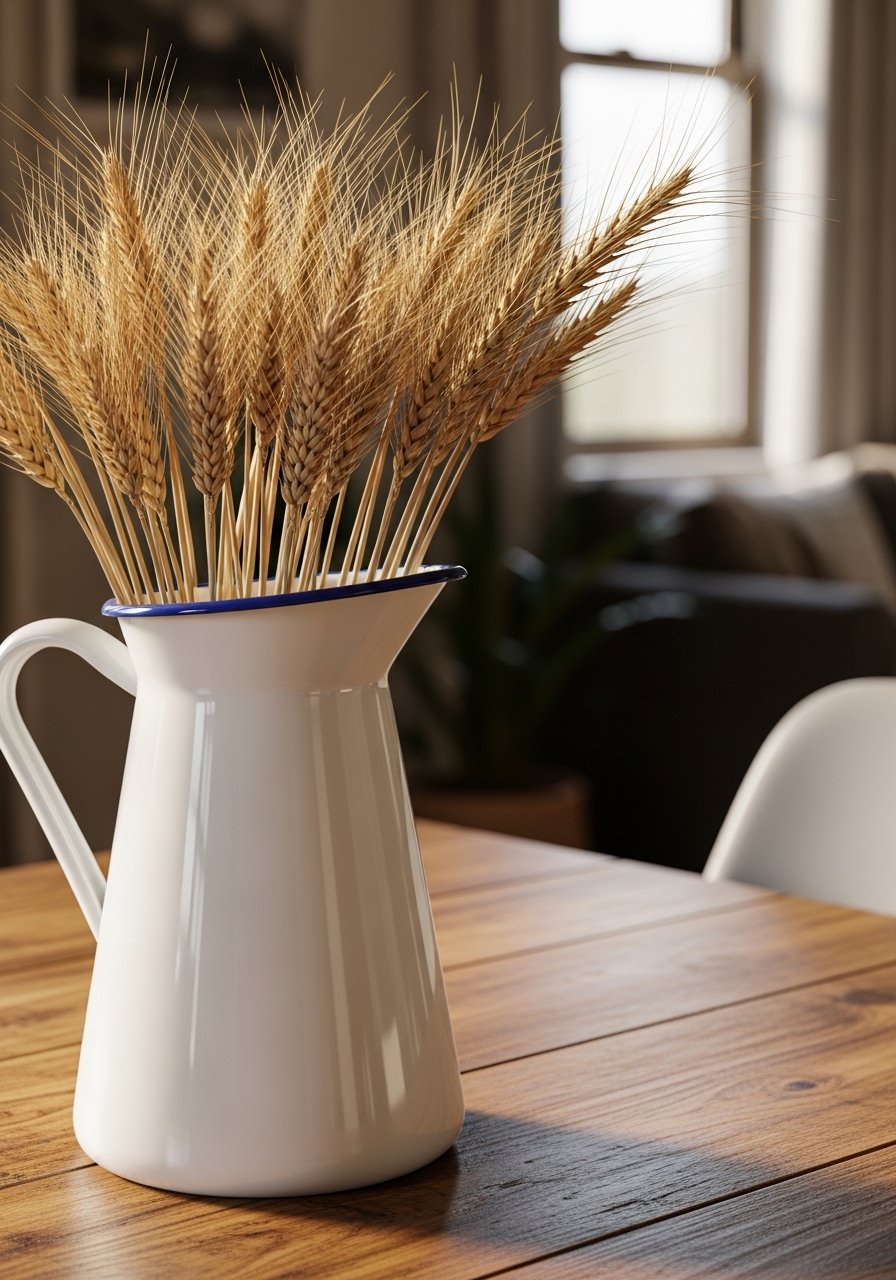 I keep an enamel jug on the table year-round. Some weeks it holds fresh flowers, other times dried stems. It’s inexpensive but reads like a real farmhouse piece.