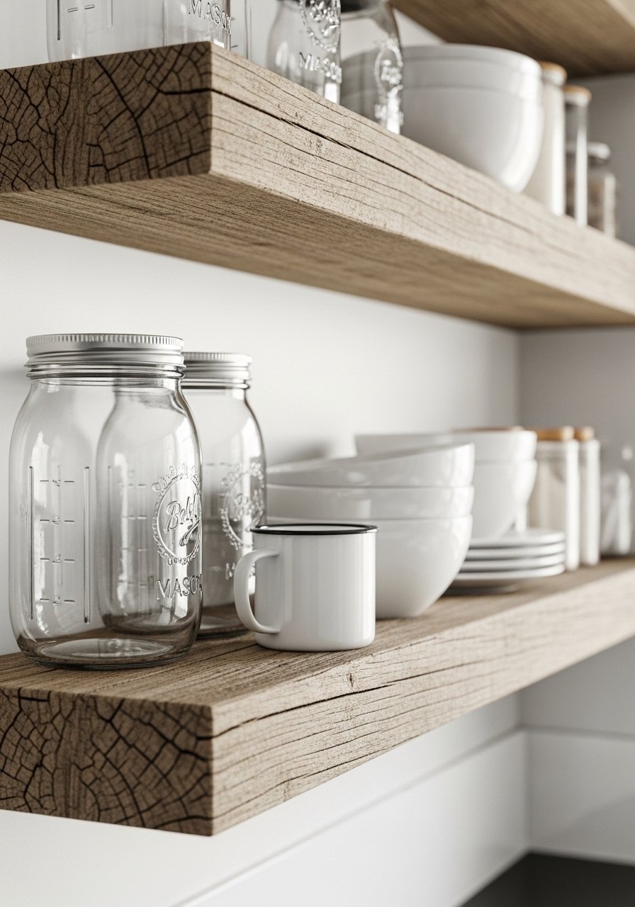Open shelves replaced a heavy cabinet in my kitchen. I added weathered wood shelves and used them for everyday dishes and a few vintage finds. The room feels lighter and more lived-in.