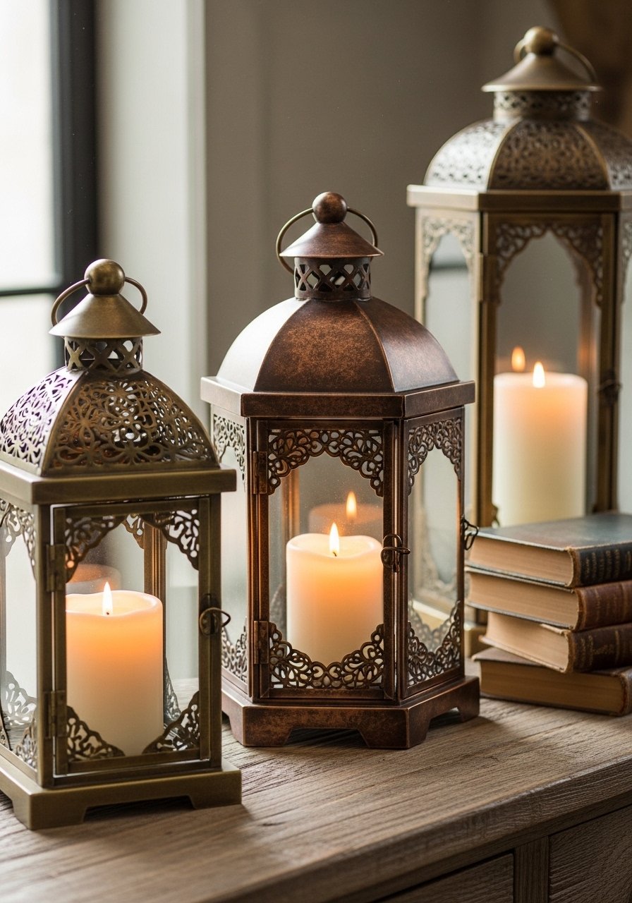 I picked up a mix of old-style lanterns and grouped them on a console. They add a nostalgic touch that’s quiet but effective. Candles inside soften the feel at night.