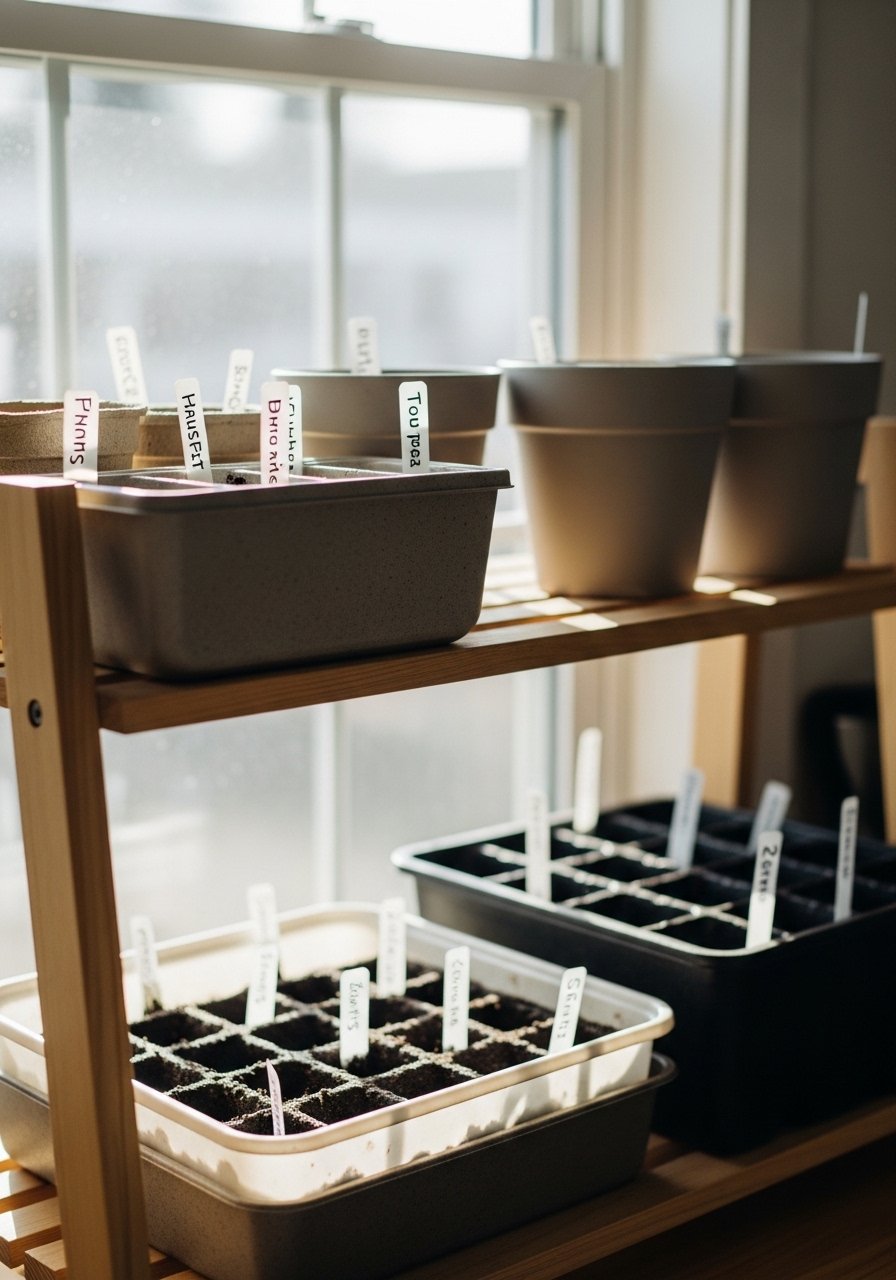 I almost used bright plastic pots; neutral ceramic looks better long term. Labeling the trays stopped me from guessing what I planted.