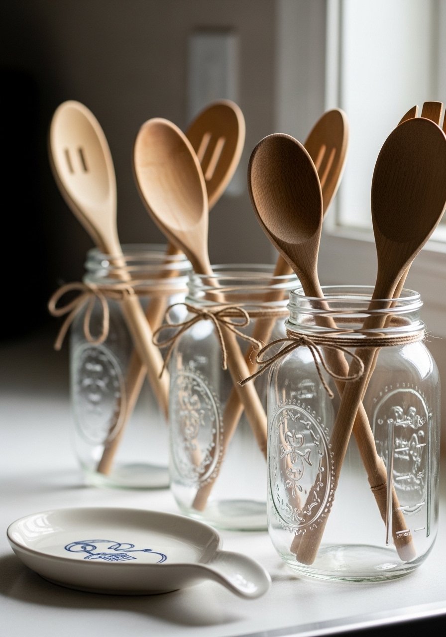 I switched to mason jars for utensils instead of a bulky crock. They feel lighter and are easier to clean. A tied piece of twine makes them look intentional.