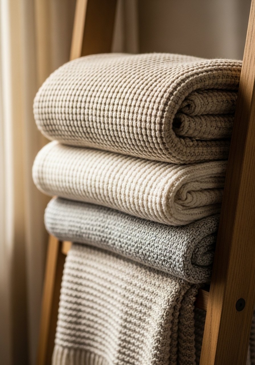 I stack folded throws on a leaning ladder next to my reading chair. It looks cozy and is actually useful. Different textures invite people to grab one and stay.