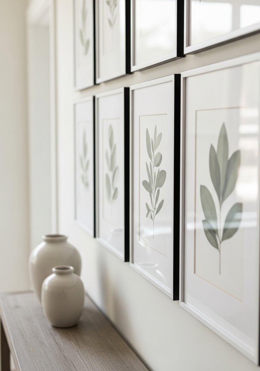 I framed botanical prints in thin black frames and hung them in a grid. The soft greens and white mats feel calm and timeless. It’s a small investment for a big visual payoff.