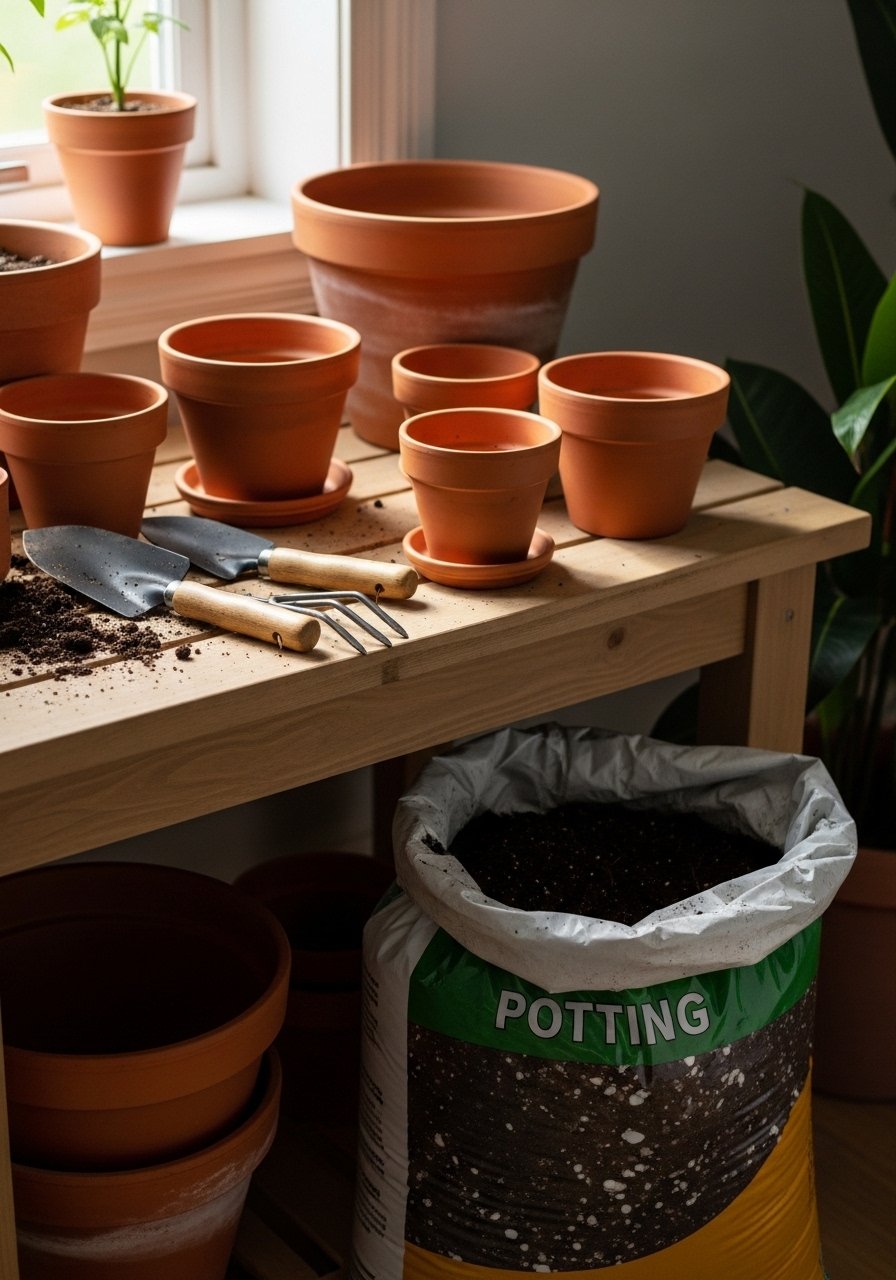 I made a small potting bench near a sunny window for repotting houseplants. It keeps dirt contained and looks like part of the decor, not a chore station.