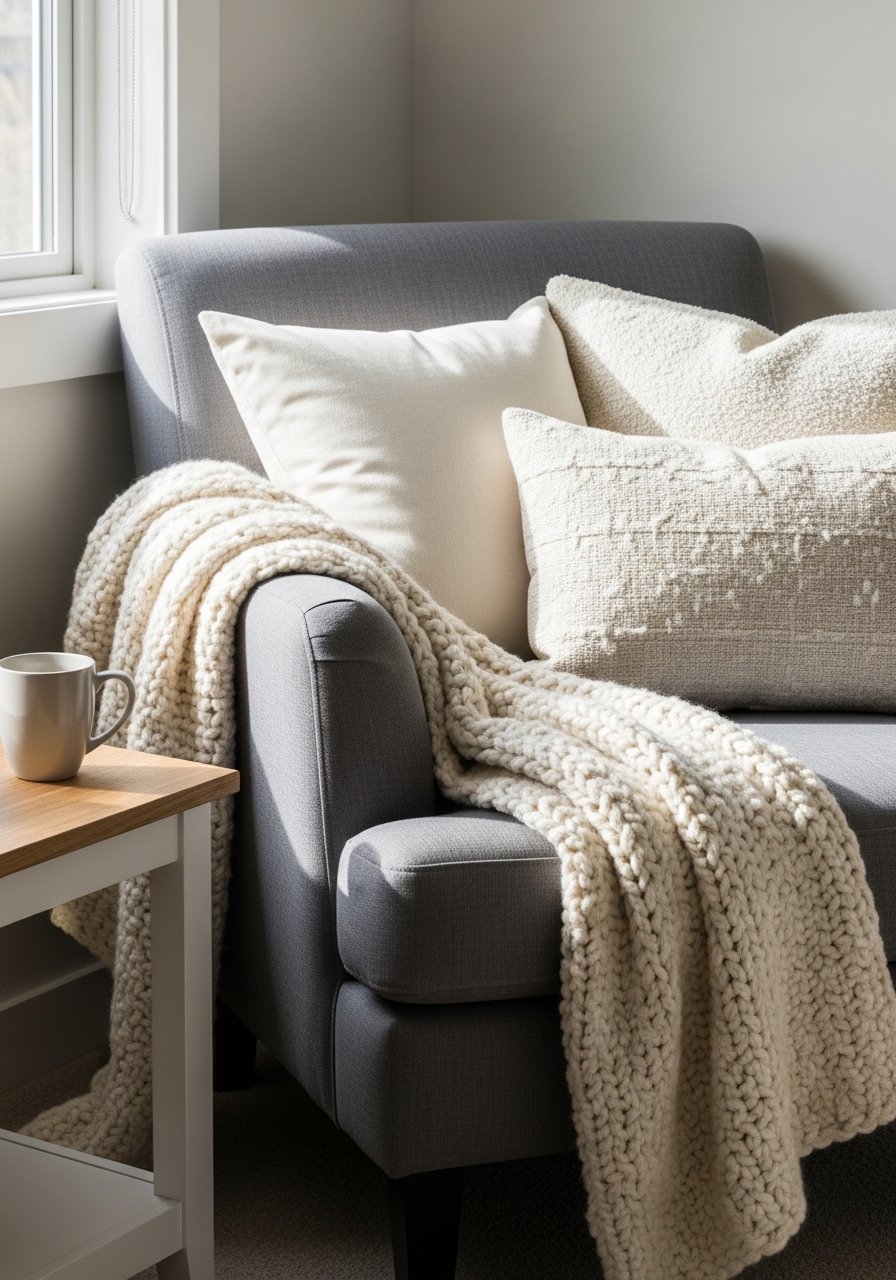 The moment I draped a chunky knit throw over my gray armchair, the whole corner stopped looking flat. For a cozy reading nook aim for a 60-30-10 color balance, where 60 percent is neutral, 30 percent is a secondary tone like soft gray, and 10 percent is an accent like faded navy. Budget under $75. Avoid tiny pillows that look decorative only. I used this chunky knit throw blanket in cream and a 22-inch euro insert for structure.