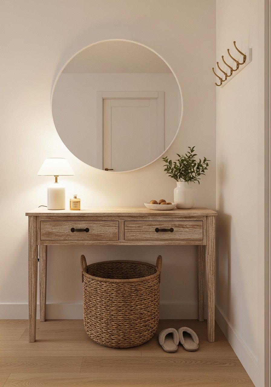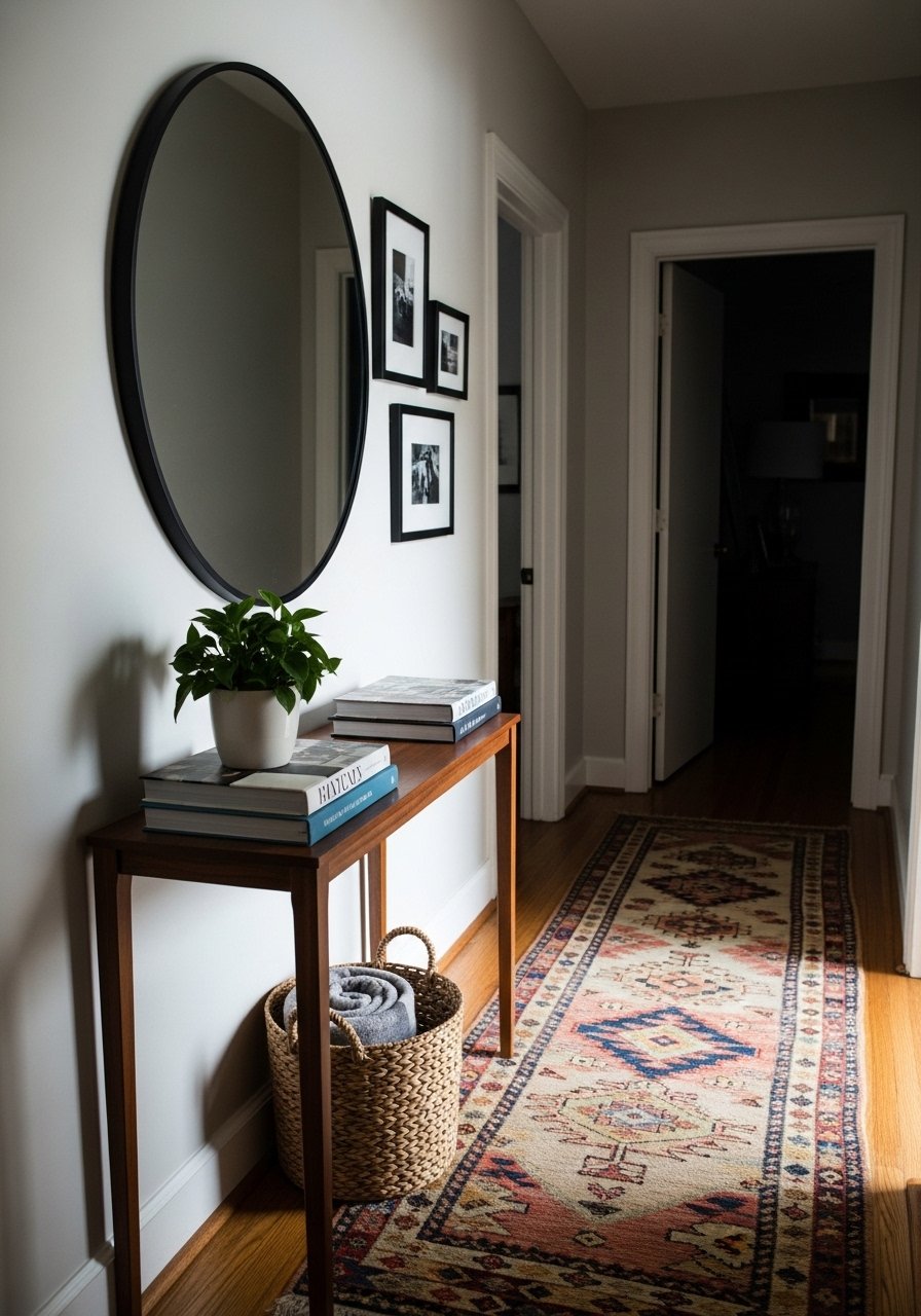 An oversized round mirror opens a small hall like nothing else. I swapped a rectangular piece for a 36-inch round and the space read taller. Mirrors should reflect light or a focal point. Avoid cheap plastic frames because they look flat in photos and real life. I used this 36-inch round mirror and hung it with a strap for an extra farmhouse cue.