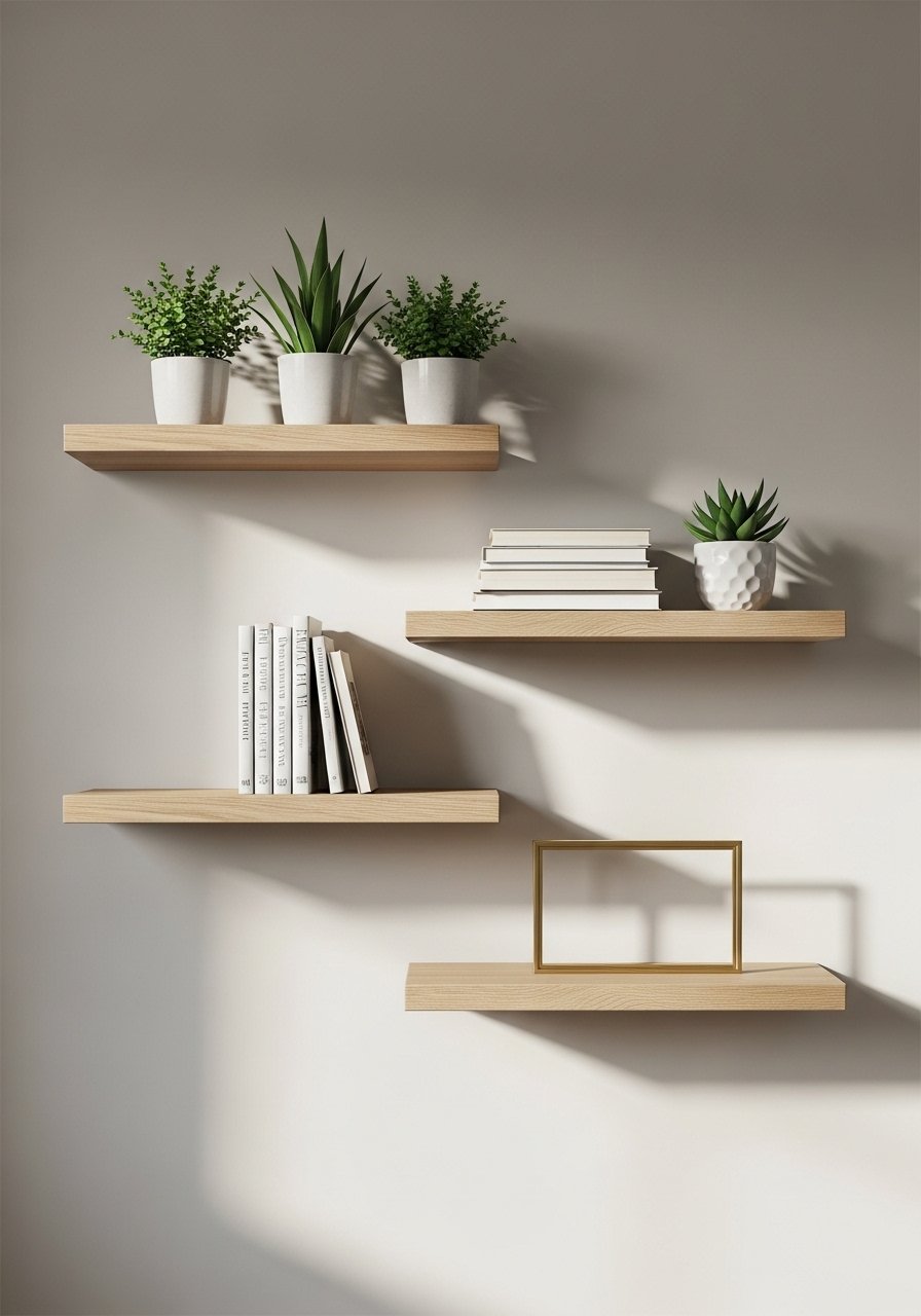 I keep seeing white oak floating shelves everywhere this year. They ground a wall without the heaviness of a bookcase. Use odd numbers when styling, like three objects per shelf. In small rooms pick shallower shelves, around 8 inches deep. A cheap trap is overloading shelves with too many small items, which reads cluttered in photos and real life. I recommend this set of white oak floating shelves and small faux succulents for low maintenance.