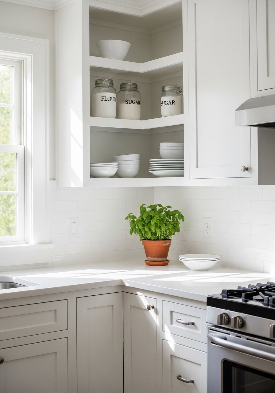 I swapped one upper cabinet for open shelving and it made the kitchen feel bigger. Use clear glass jars labeled "Flour" and "Sugar" in minimalist sans-serif for cohesion. Keep like-items grouped in threes for balance. For rent-ers, peel-and-stick backsplash behind the shelf creates depth. Avoid mismatched jars with different lid finishes, which reads messy in photos. I used mason jars with lids and a small potted herb on the edge.