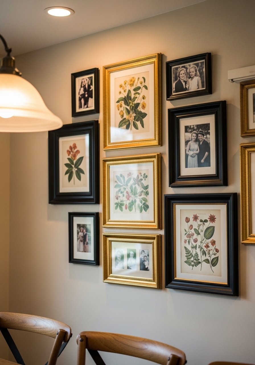 I found most frames at thrift stores for under $5 each. The trick is consistent matting. Buy new white mats to keep the look elevated. Arrange frames using the odd-number rule, and anchor the grouping at eye level. Avoid hanging them too high, which makes meals feel awkward. I used a mix of brass and black frames and fresh white mats from Amazon for a high-end look while spending under $100 total.