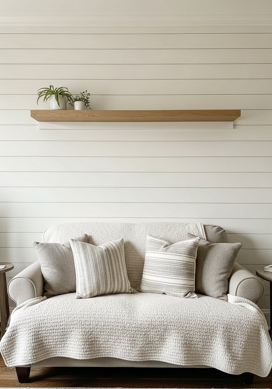 I painted shiplap warm white instead of stark white to keep the room soft. Horizontal boards visually widen a space. In small rooms use thinner boards for scale. The cheap version that looks dated is glossy paint and wide gaps. Use satin finish and 1×6 or 1×8 shiplap for the right farmhouse texture. I paired the wall with linen cushions and a rattan pendant for contrast.