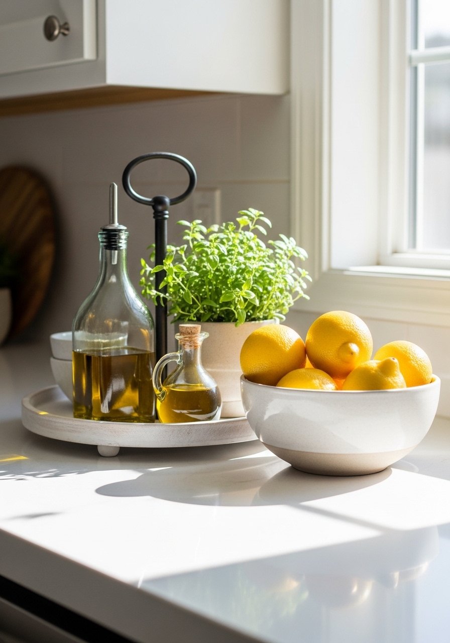 A small tiered tray made the countertop look intentional instead of messy. I keep functional items on the bottom tier and decorative ones on top. The rule I use is function on the first tier, aesthetics on the top two. Avoid overstuffing the tray so each object breathes. I recommend a metal tray in matte black for contrast with white counters.