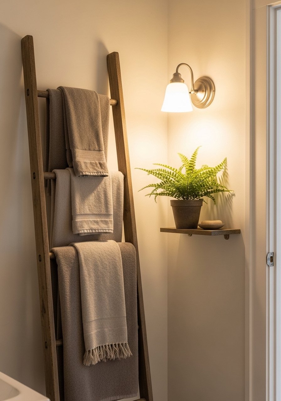 I swapped bar rods for a leaning ladder and towels finally looked styled. Choose a ladder about 72 inches tall for standard ceilings. Linen towels read relaxed and dry faster. A mistake I see is choosing a dark stain that clashes with chrome fixtures. I went with natural wood and hung three towels in staggered lengths for a layered look.