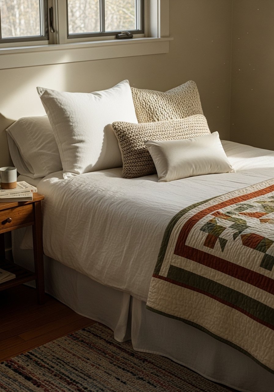 I stopped buying matching sets and started layering linen, cotton, and a cotton-knit throw. The ratio I use is one large Euro, two standard pillows, and one accent pillow. For small bedrooms keep the quilt lightweight so the bed does not overwhelm the room. Avoid glossy synthetic fabrics that shine under light and photograph poorly. I use neutral linen sheets and a woven throw for depth.