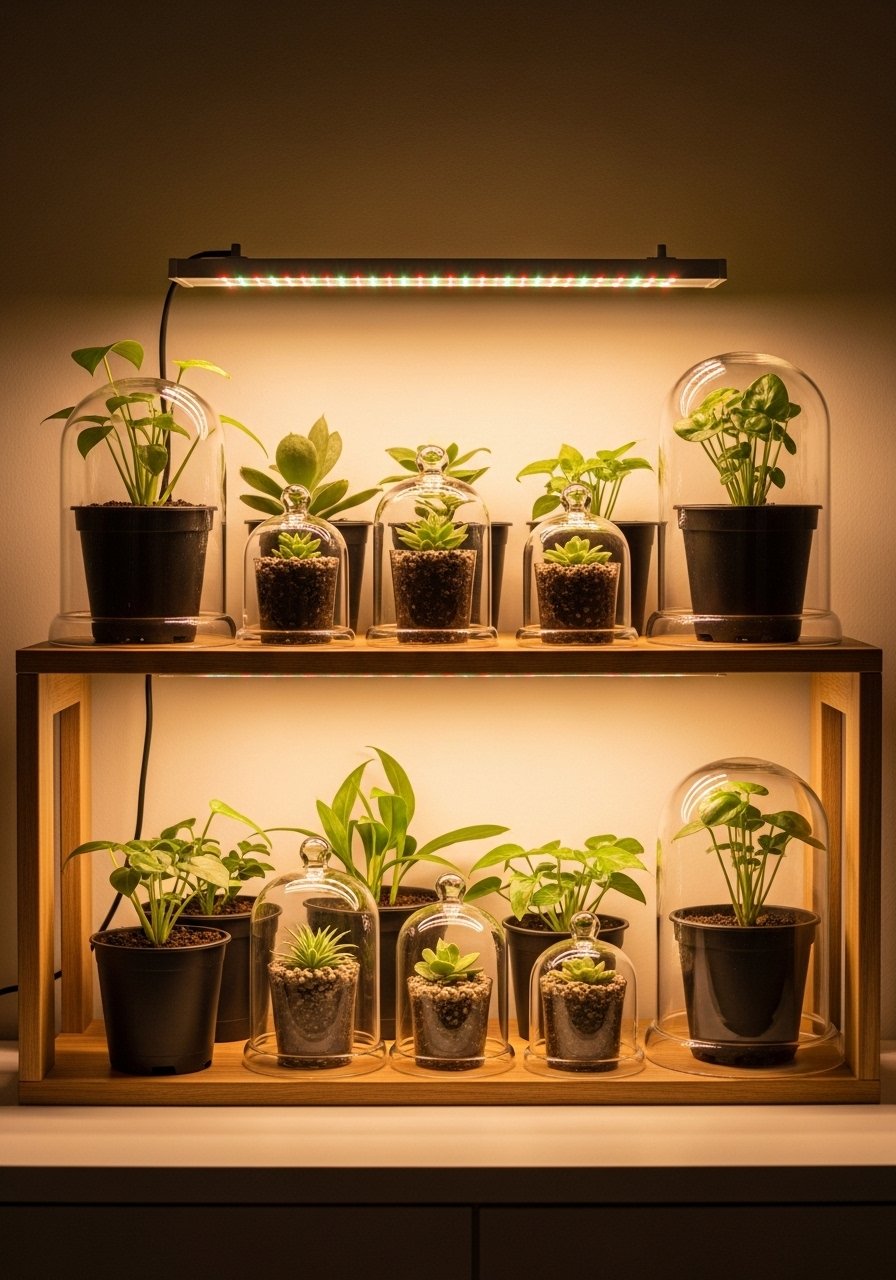 I built a slim greenhouse shelf for propagated plants and it keeps humidity up. Use glass cloches for seedlings and a grow light on a timer. In apartments pick compact shelving about 12 inches deep. Overcrowding is a common mistake because plants need airflow. I keep each cloche on a rotation schedule and label the pots with plant names.