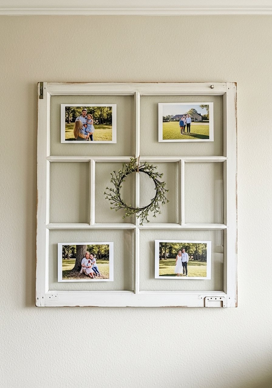 I found an old window and turned it into a photo display. Use four equally sized frames behind glass to create consistent sightlines. The error I made once was using different photo sizes, which looked chaotic. I sanded and whitewashed the frame to match my trim. The piece cost under $40 and feels custom.