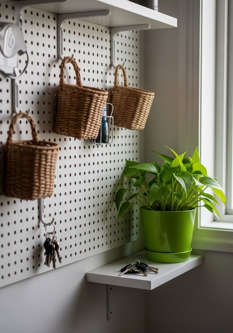I painted a pegboard and the wall became a flexible organizer. Pegboards are great for small kitchens or entryways because you can rearrange hooks and baskets. Use odd-number groupings for charm. Avoid filling every peg, it looks cluttered fast. For a modern farmhouse vibe choose a warm white and add woven baskets for texture.
