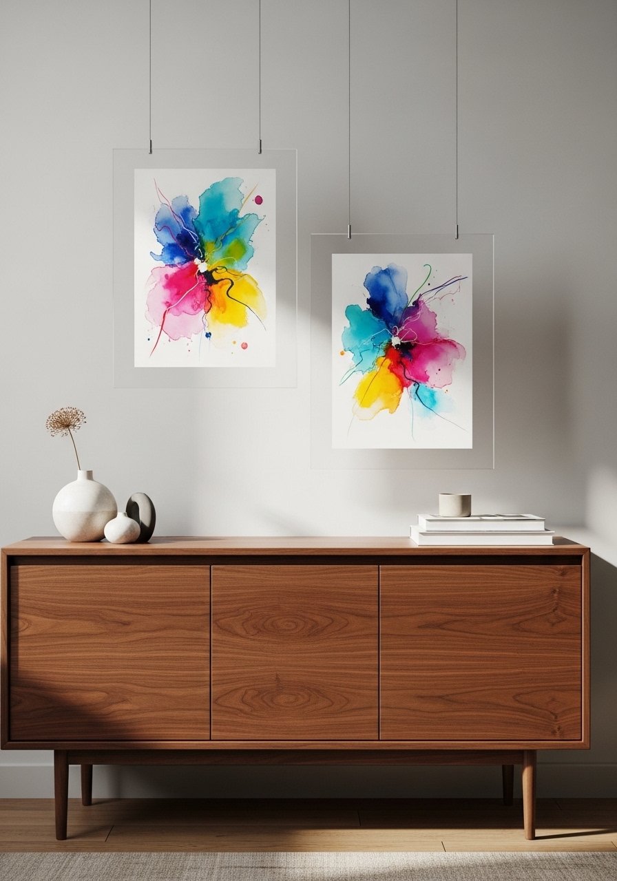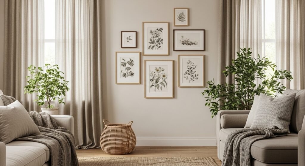 Floating acrylic frames make art feel airy and modern. I used clear float mounts on small botanical prints so the wall color reads through and the pieces feel integrated. I mounted them with clear float-style frames. Common mistake: setting them too high; keep centers at eye level (about 57–60 inches). These are great when you want the wall color and texture to be part of the composition.
