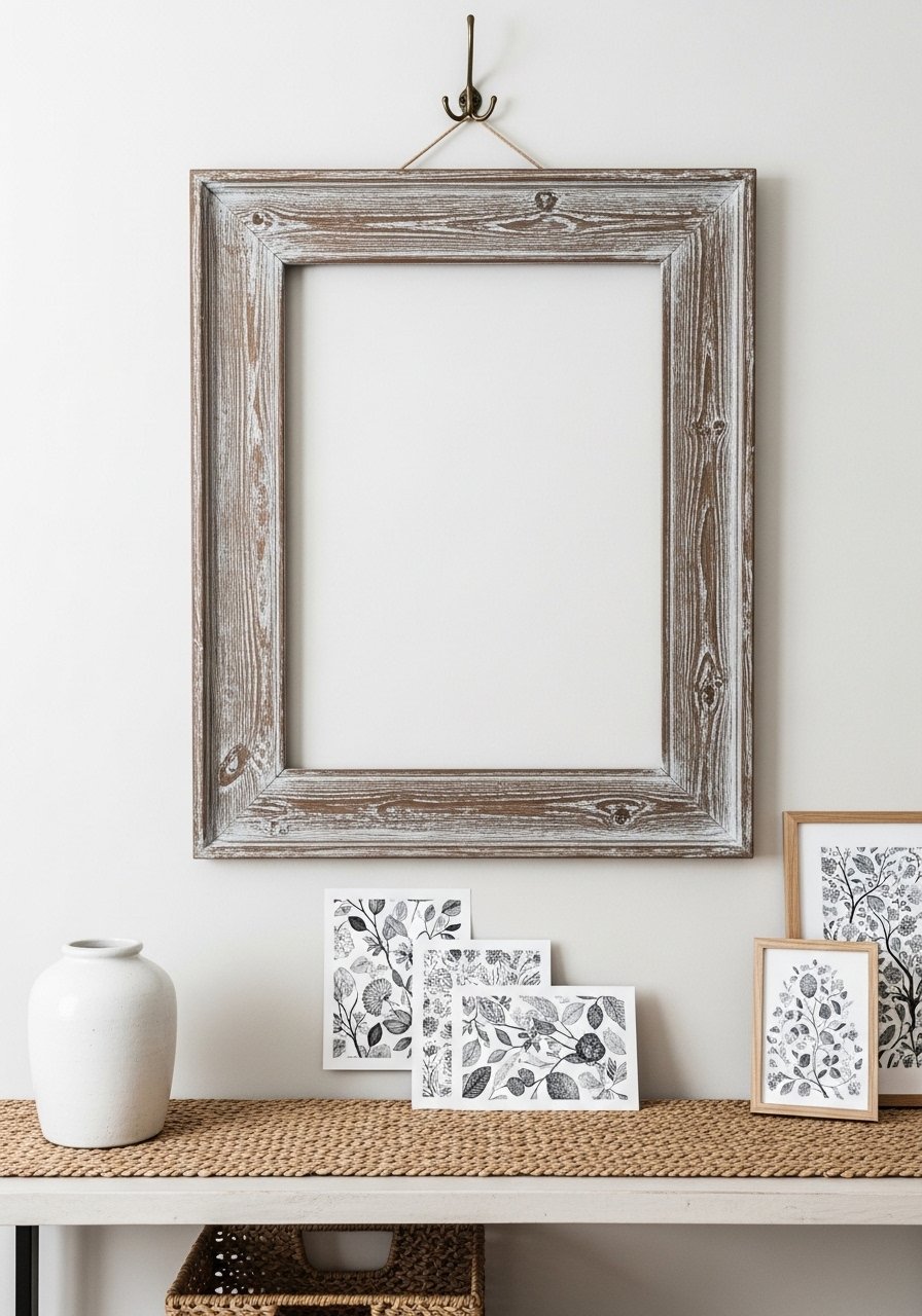 A warm distressed wood frame instantly gives prints a lived-in, cozy vibe. I picked a 16×20 reclaimed-look frame to anchor a small console area; the wood tone pulls in my oak console and rattan basket. I like distressed wood frames in warm brown. Don’t go too ornate — too much carving competes with simple art. Stick to one warm wood tone to avoid a clashing palette in small spaces.
