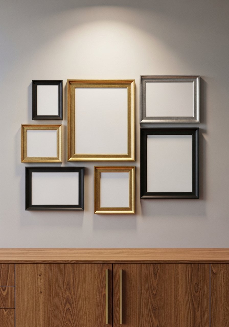 I mixed warm brass, brushed nickel, and black frames to create a layered, current look without being matchy-matchy. The variety reads curated and intentional. Start with a mixed-metal frame set so scales coordinate. A common error is using too many different finishes — limit to three to keep it cohesive. Mixed metals pair well with dark wood and velvet seating for contrast.