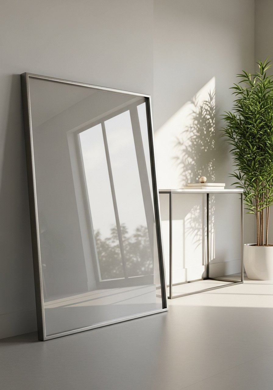 Leaning a large frame on the floor makes a small room feel taller. I used a 30×40 frame with a soft matte and it created an architectural moment without heavy hardware. I recommend an oversized black floor frame. Don’t let the frame hide baseboard heaters or outlets; place it where it complements furniture lines. This gives drama without committing to nails.
