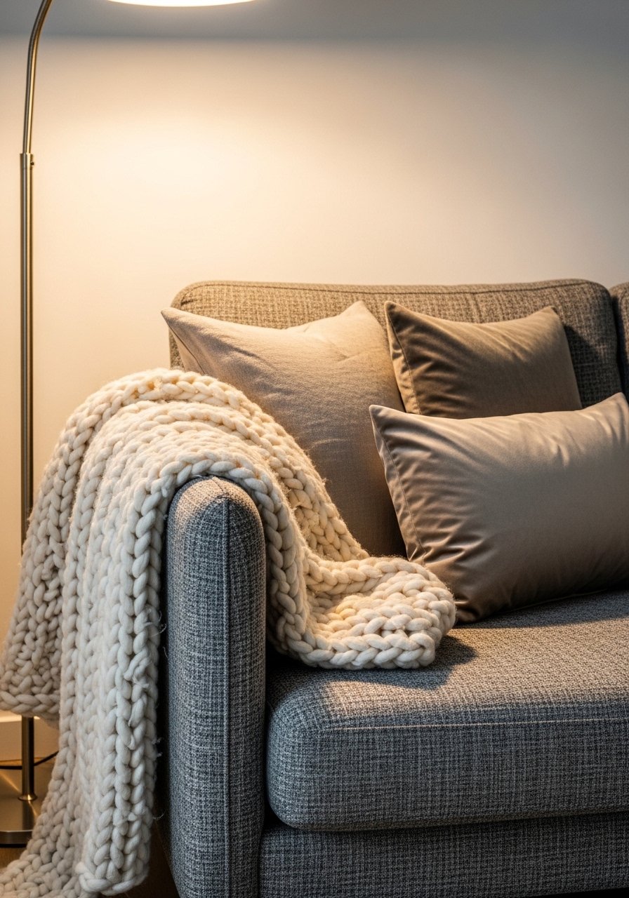 The moment I draped a chunky knit throw over my sofa, the room stopped feeling flat. I used a 60-30-10 rule with textiles, 60 percent neutral base, 30 percent textured layer, 10 percent accent color. Works best in living rooms and bedrooms on a $40 to $120 budget. Avoid mixing too many patterns. I like cream chunky knit throws and 22-inch euro pillow inserts. In photos it looks perfectly styled. In real life cushions settle. Fluff them daily.