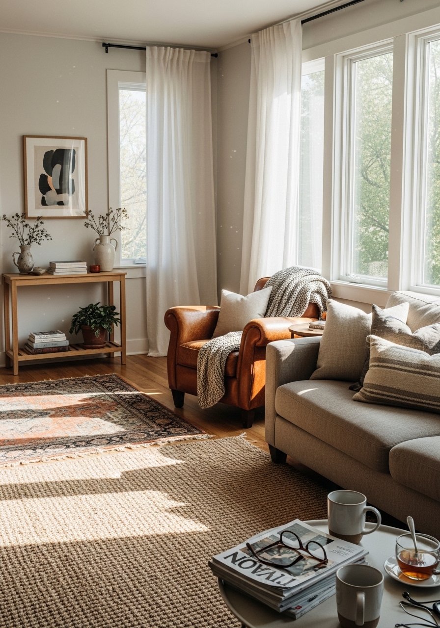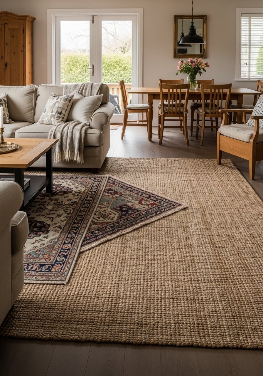 I layered a 9×12 jute rug with a smaller 5×8 wool rug centered under the coffee table. The ratio I use is a large base rug then a smaller layer at 60 percent of its size. Budget $50 to $300. Avoid clashing patterns. Keep one neutral base. I bought jute area rug 9×12 and wool accent rug 5×8. Photos make layers look intentional. In real life they anchor seating zones.