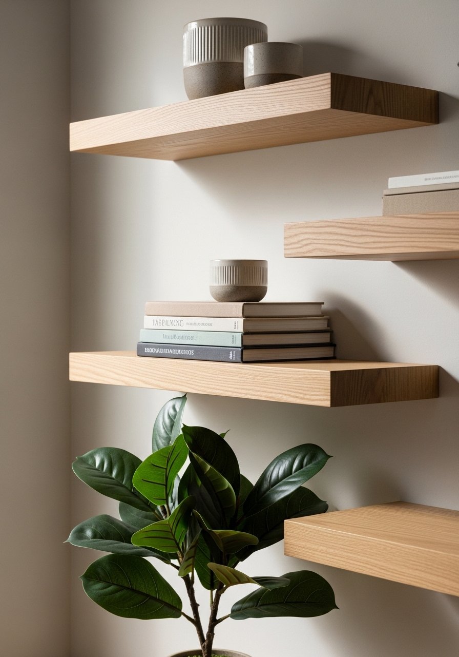 Floating Shelves With Curated Greenery in Modern Minimalist Spaces
