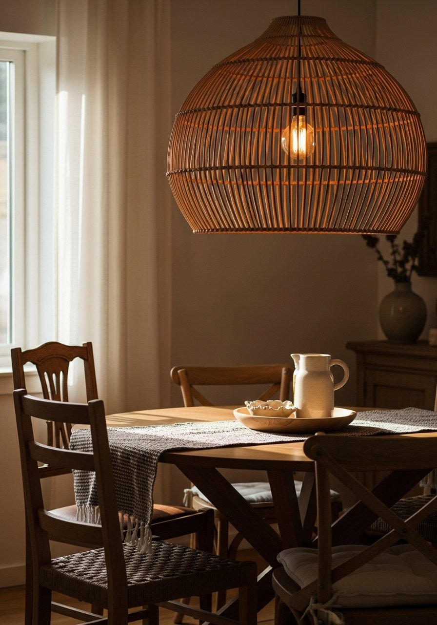 I swapped a dated fixture for a woven rattan shade and warm bulbs. Swapping the shade cost under $50 and instantly modernized the space. Avoid bulbs that are too bright. Choose warm white 2700K. I used rattan pendant light shades and LED Edison bulbs warm white. Photographs love the warm glow. In real life dimmers make the look more versatile.