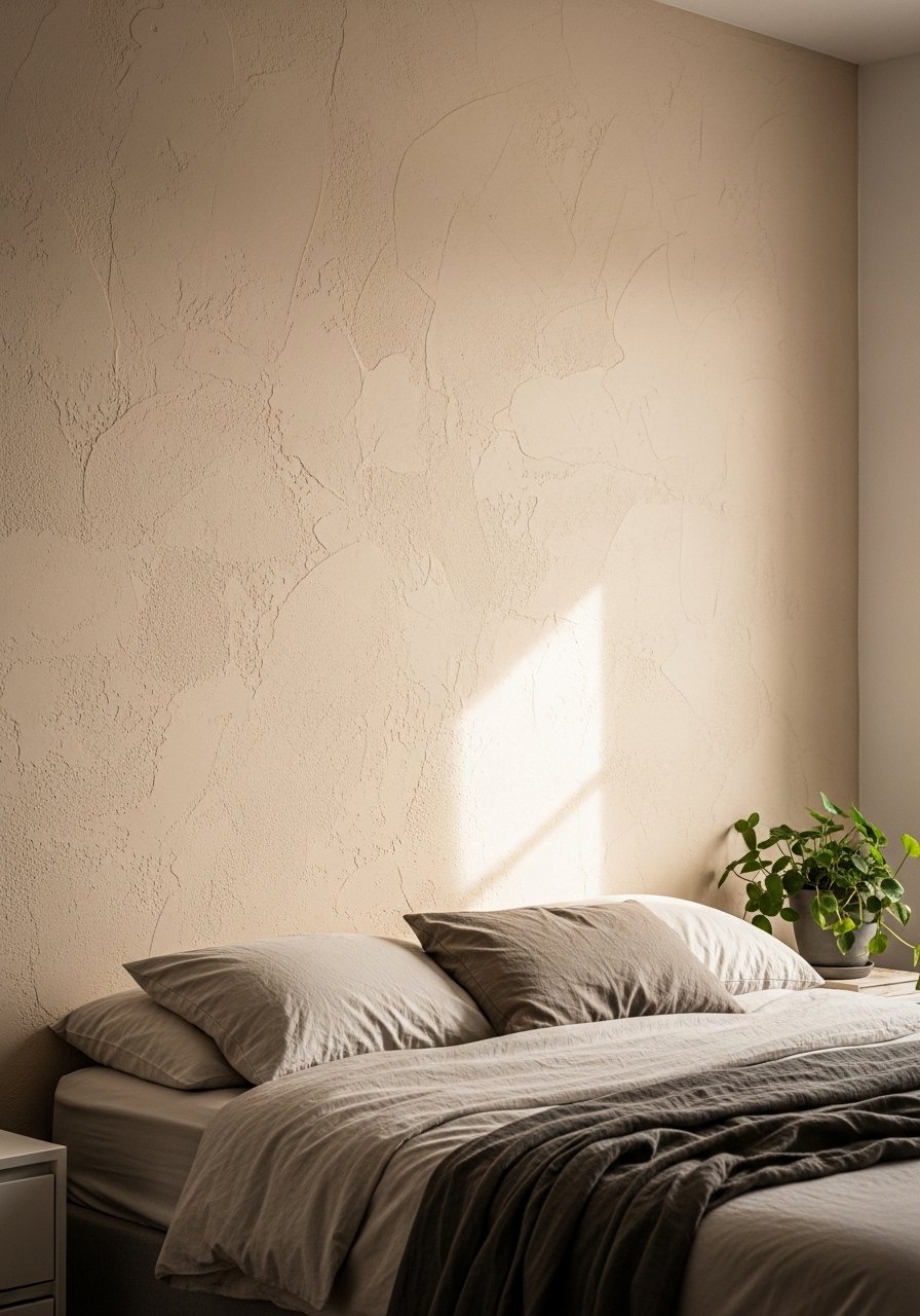 I spread joint compound in irregular strokes for a plaster look that costs under $30. Finish with matte paint in a warm neutral. The common mistake is over-texturing. Keep strokes varied and thin. This technique works best on a single accent wall in living rooms or bedrooms. I used joint compound lightweight and a wide drywall knife. Photos exaggerate texture. Up close it adds depth without heavy maintenance.